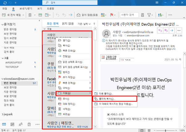 - 메일 선택 후 마우스 오른쪽 클릭 > [이동] > [다른 폴더] 또는 [폴더에 복사] 선택