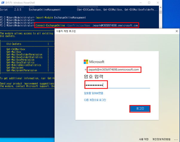 - 명령어 : Connect-ExchangeOnline -UserPrincipalName admin@contoso.com