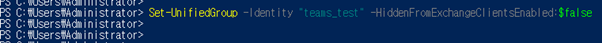 - 명령어 : Set-UnifiedGroup -Identity "teams_test" -HiddenFromExchangeClientsEnabled:$false