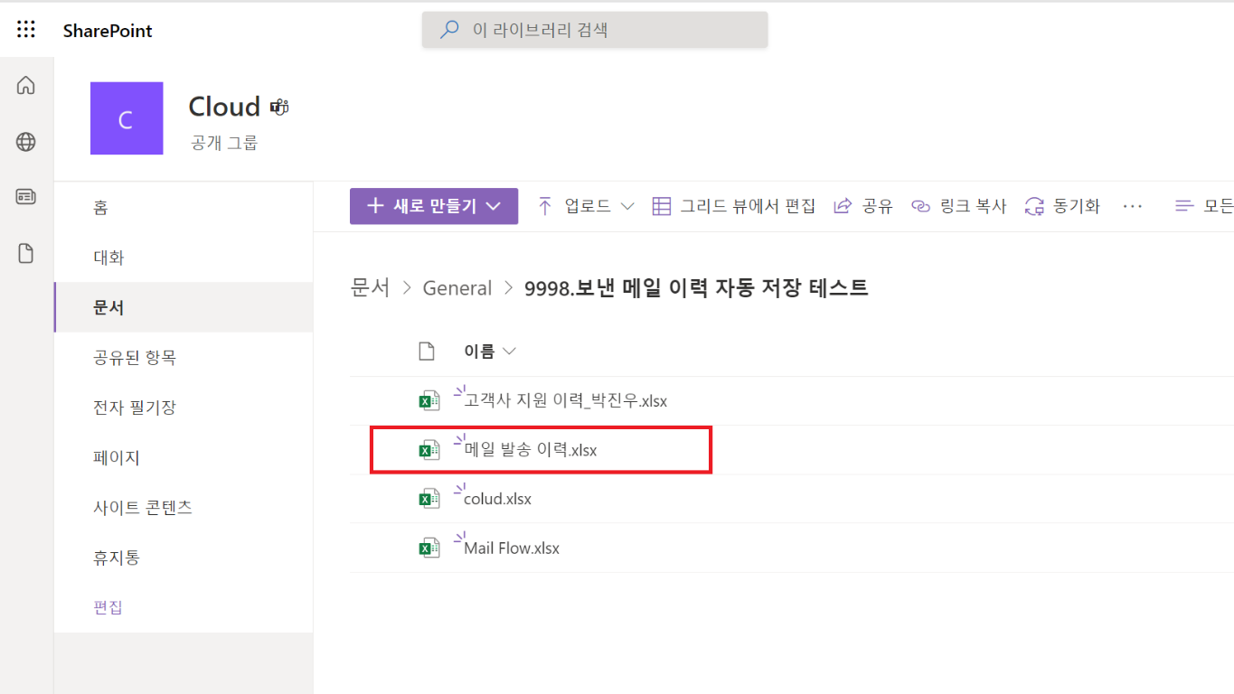 - 문서 라이브러리 : Excel 파일이 존재하는 최상단 라이브러리 선택