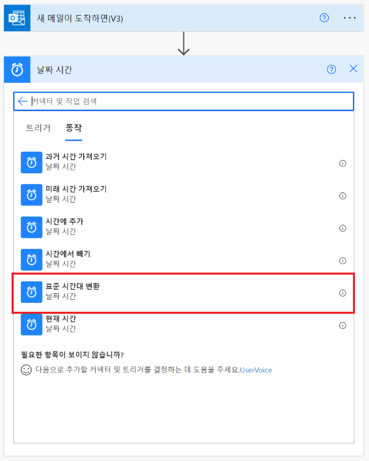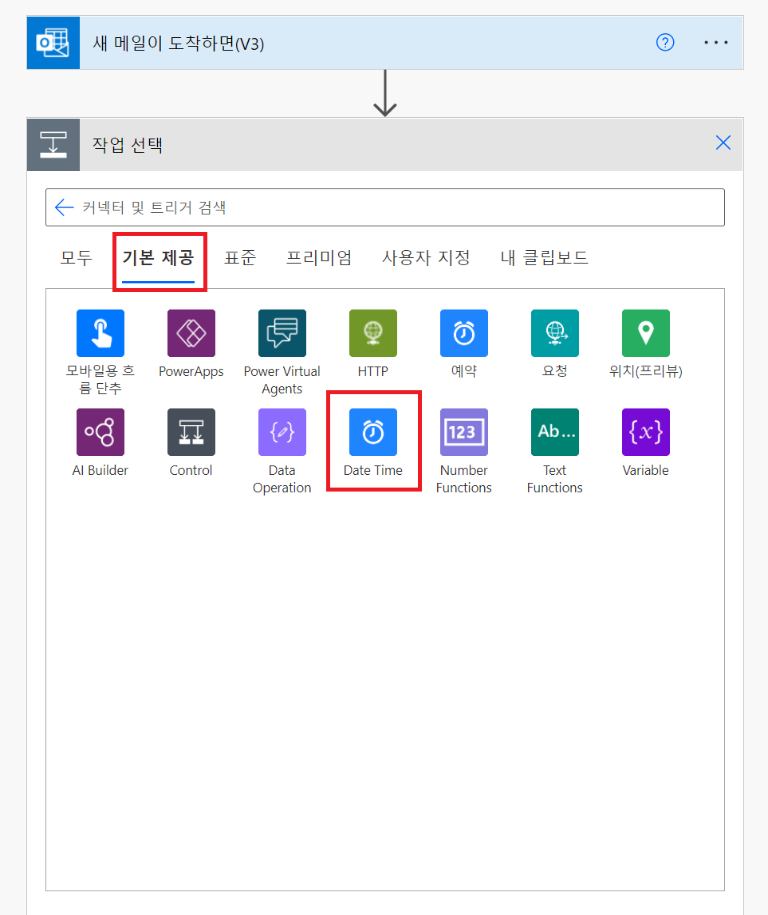 5. [새 단계] 추가 후 [기본 제공] 메뉴에서 [Date Time] 선택