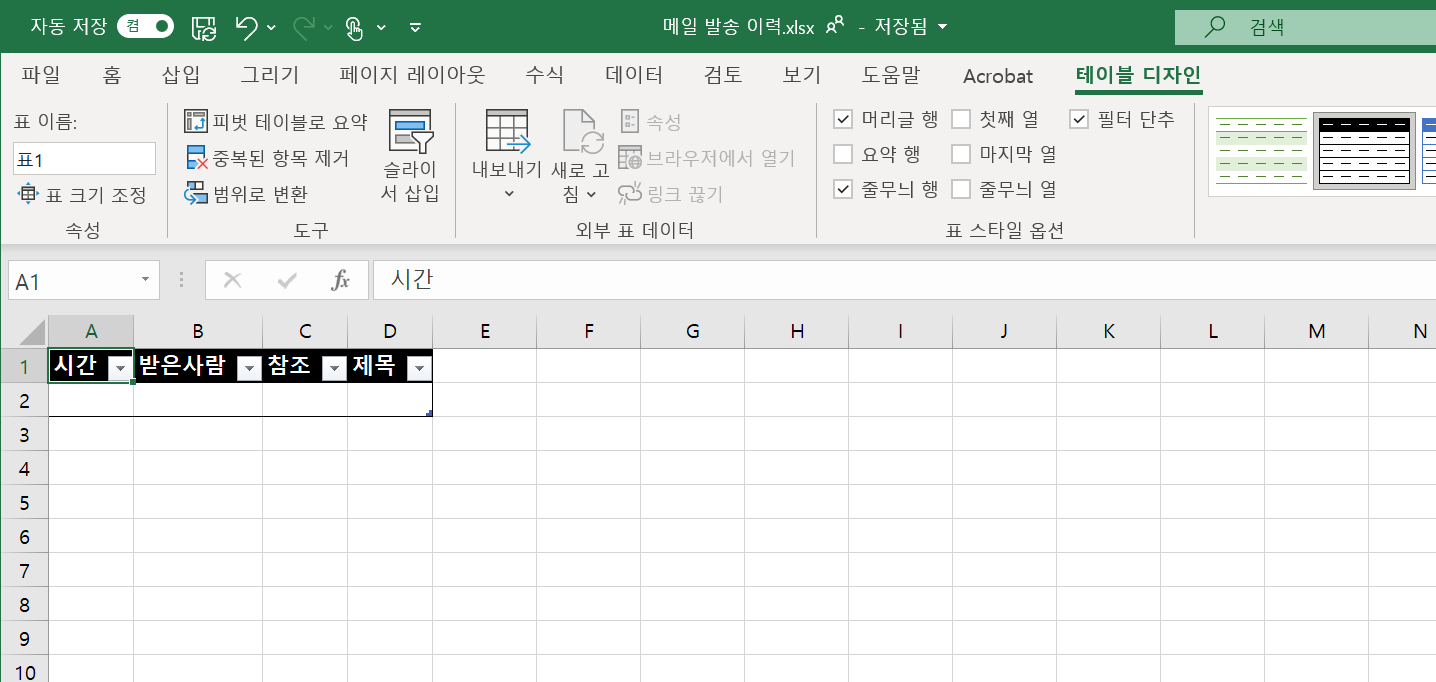 - 메일 수신, 발신 이력의 확인하고자 하는 항목에 대해 Excel 파일의 표 테이블을 생성 필요