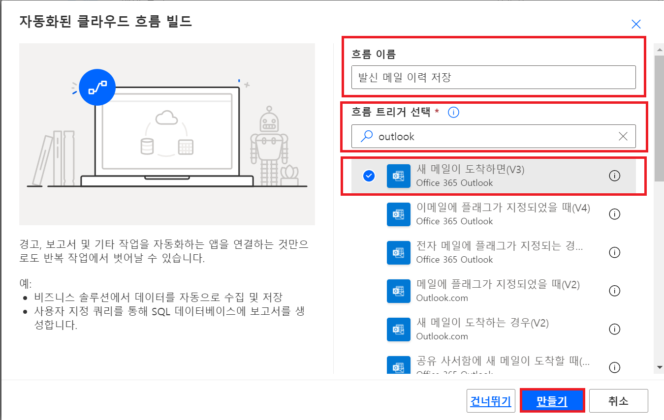 2. [Power Automate] > [내 흐름] > [+새 흐름] > [자동화된 클라우드 흐름] 생성