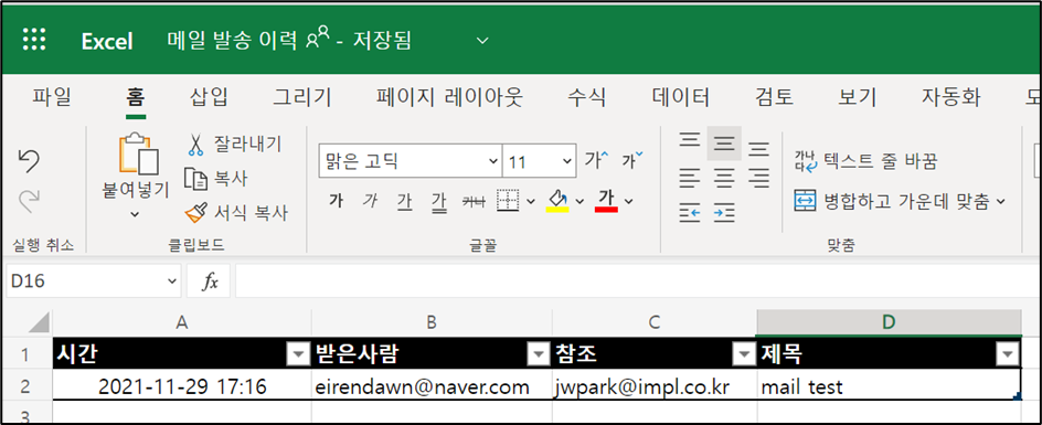 - Outlook에서 메일 발송 후 사전 작업 시 생성한 Excel 파일에 이력 자동 기록 여부 확인