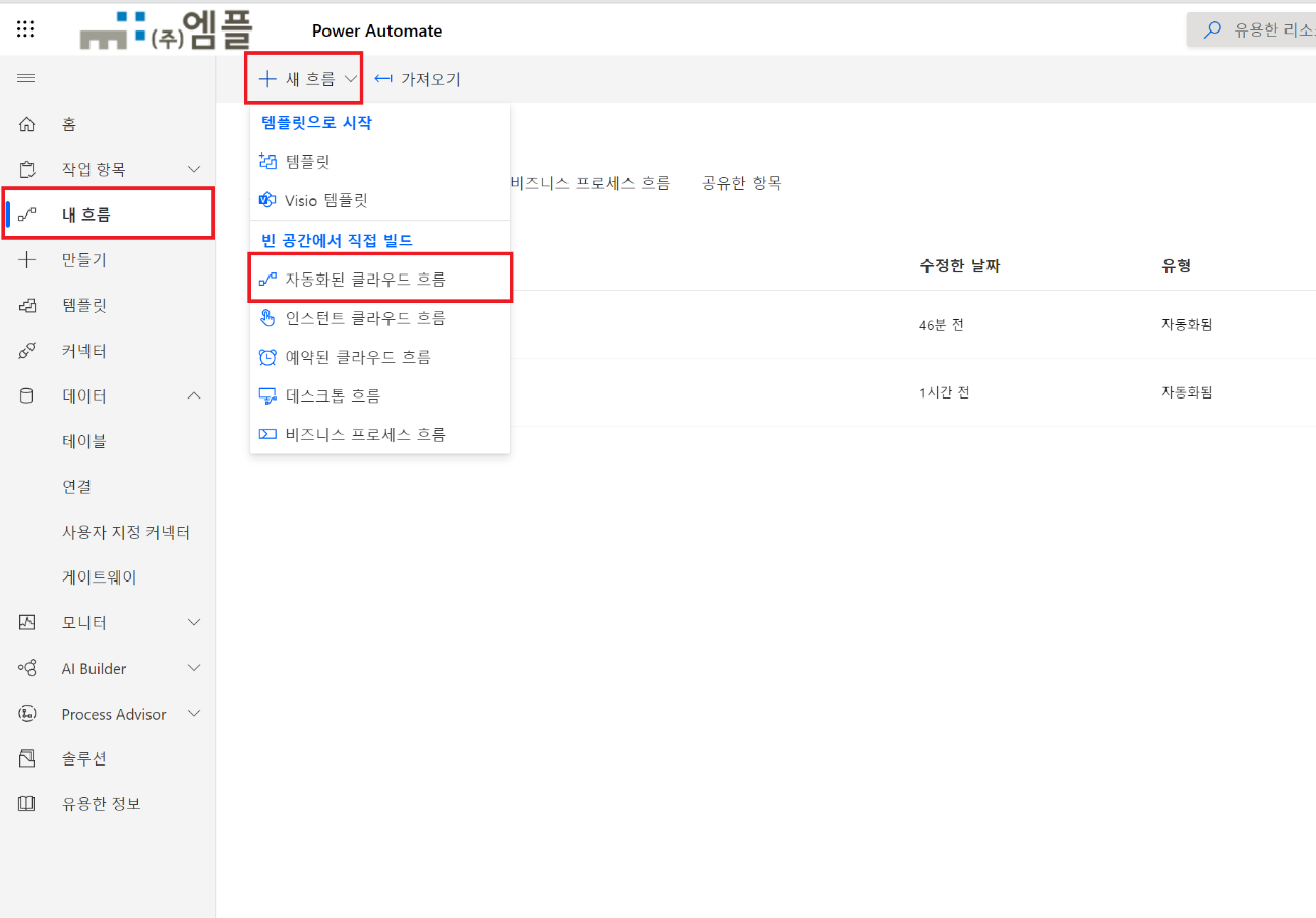 2. [Power Automate] > [내 흐름] > [+새 흐름] > [자동화된 클라우드 흐름] 생성