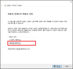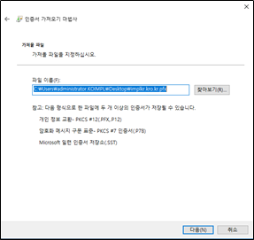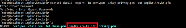 - 명령어 : openssl pkcs12 -export -in cert.pem -inkey privkey.pem -out implkr.kro.kr.pfx