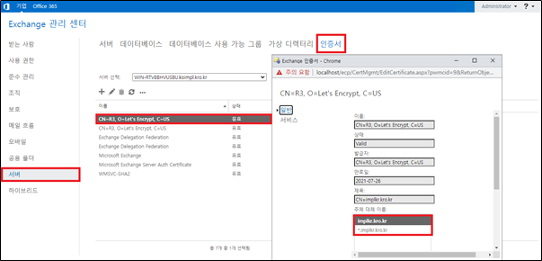 - Exchange 관리센터 > [서버] > [인증서] > 등록된 인증서 확인