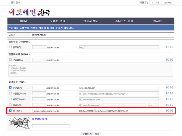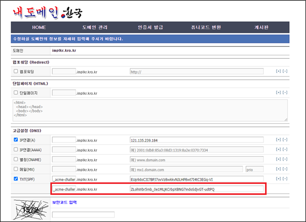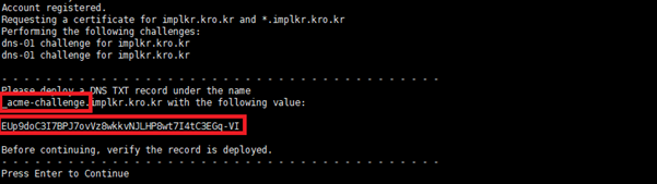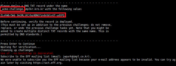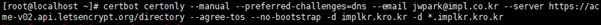 - 명령어 : certbot certonly --manual --preferred-challenges=dns --email jwpark@impl.co.kr --server https://acme-v02.api.letsencrypt.org/directory --agree-tos --no-bootstrap -d implkr.kro.kr -d *.implkr.kro.kr