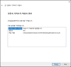 - 명령어 : openssl pkcs12 -export -in cert.pem -inkey privkey.pem -out implkr.kro.kr.pfx