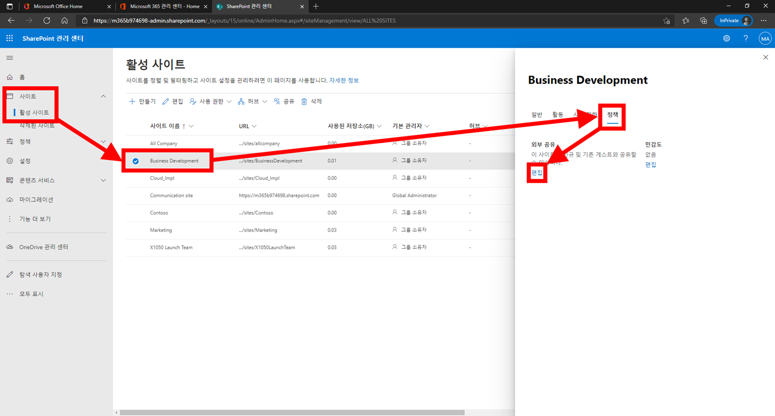 2. 사이트 → 활성 사이트 → 공유하고자 하는 사이트 → 정책 → 편집을 선택합니다.
