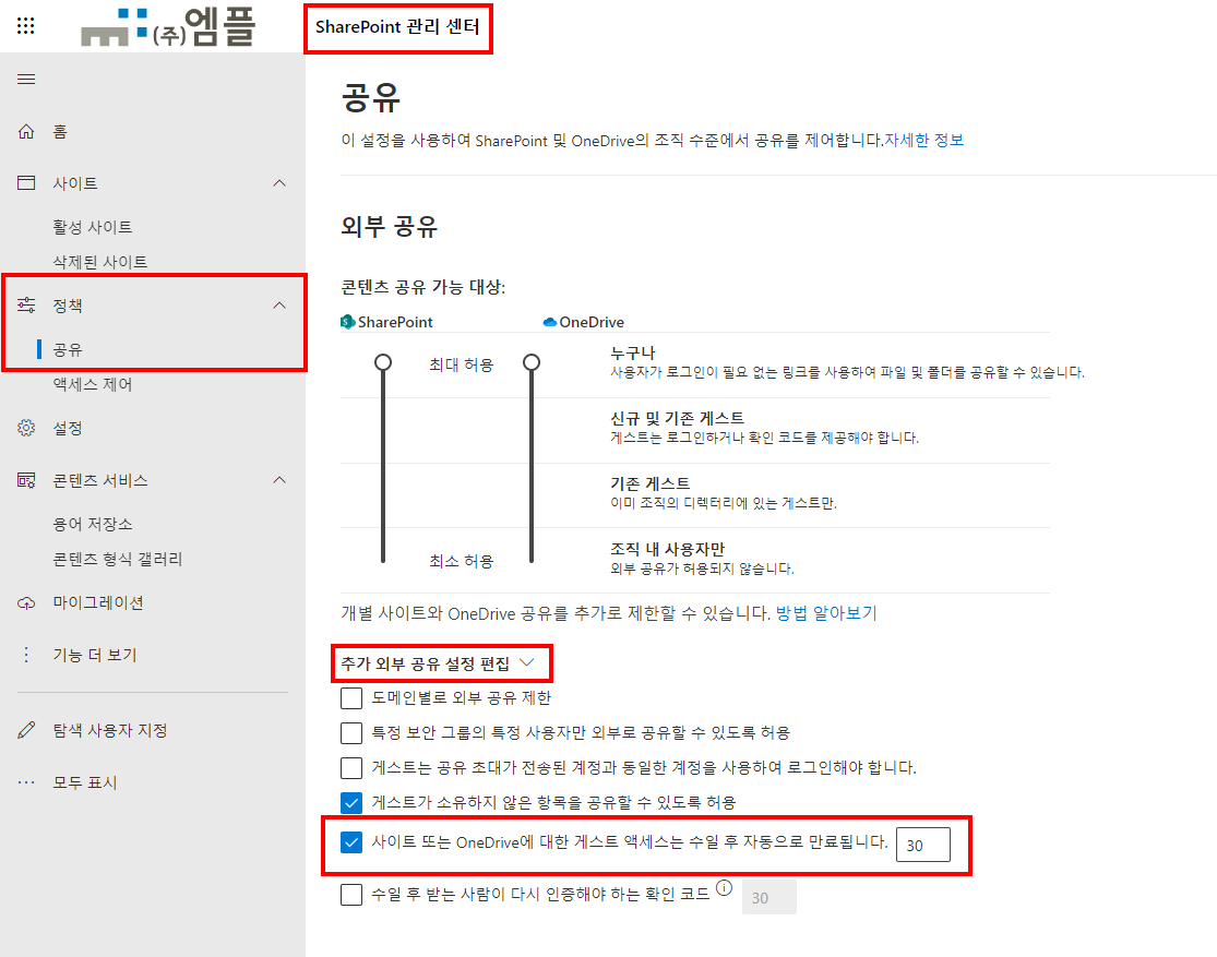 - [Microsoft 365 관리센터] > [SharePoint 관리 센터] > [정책] > [공유] > [추가 외부 공유 설정 편집] >
