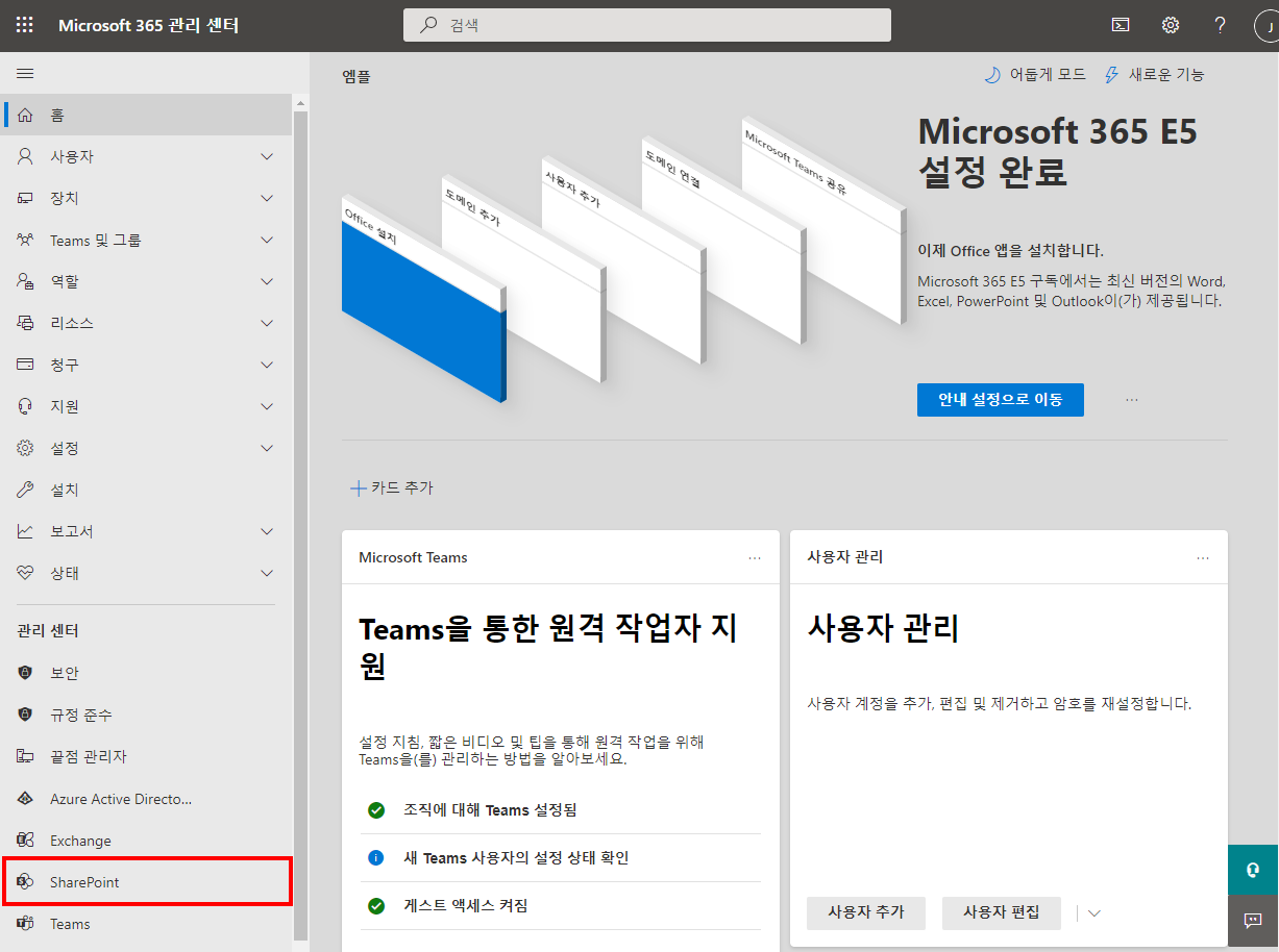 1. [Microsoft 365 관리자 페이지] 접속 > [SharePoint] 관리 센터 접속