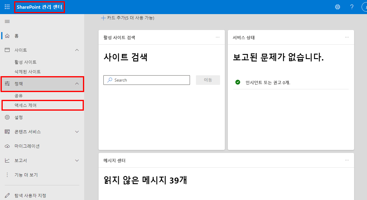 2. [SharePoint 관리 센터] > [정책] > [엑세스 제어]