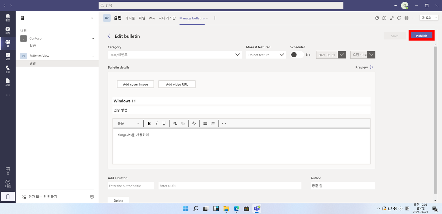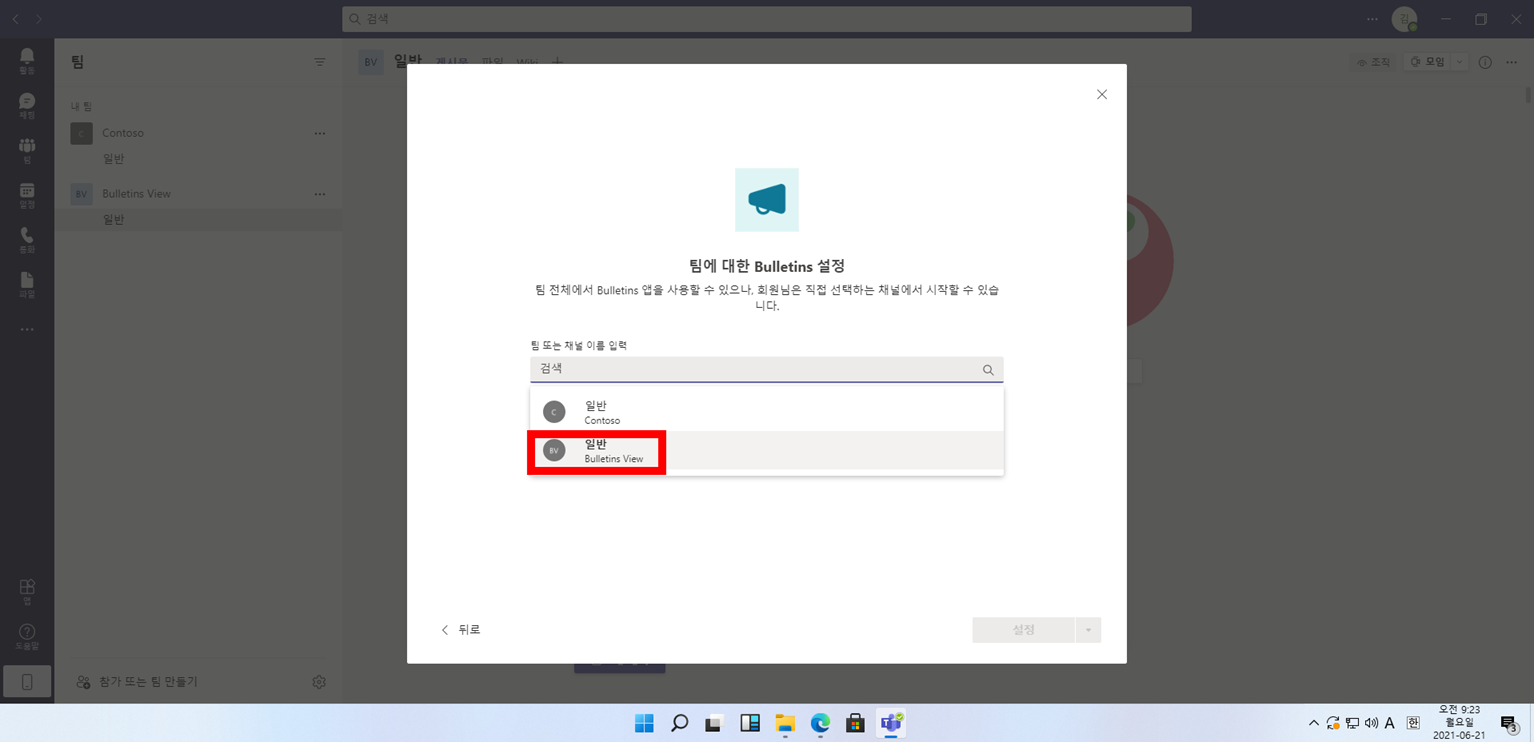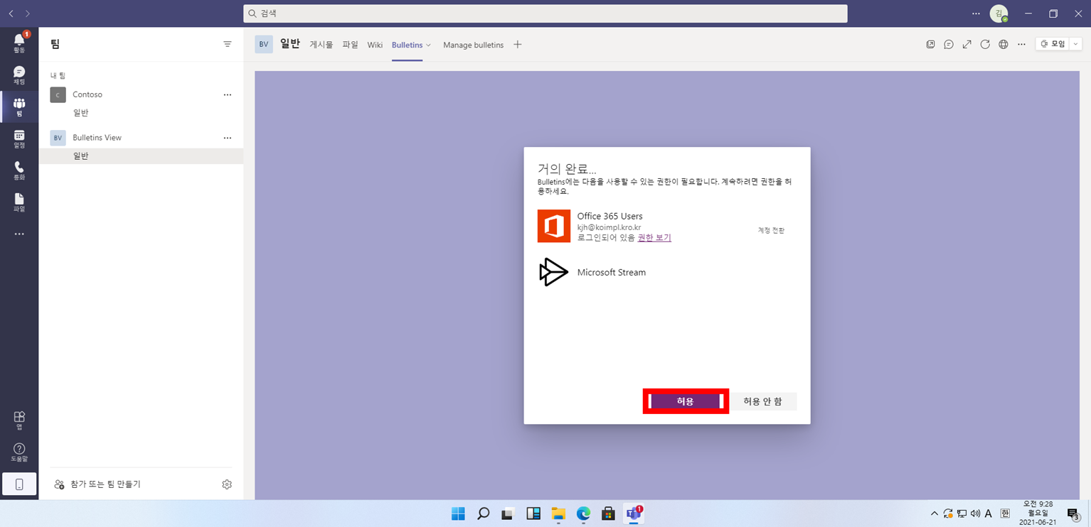4. Azure Active Directory에 연결된 Teams Application에 Bulletin가 연동되며 3~10분까지 걸릴 수 있습니다.