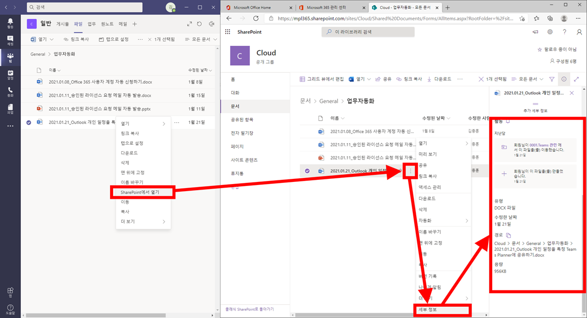 문의 내역 : Teams 파일 업로드 이력 관리 방법