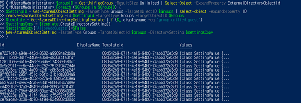 | $groupID = Get-UnifiedGroup -ResultSize Unlimited | Select-Object -ExpandProperty ExternalDirectoryObjectId Foreach ($Groups in $GroupID) { $template = Get-AzureADDirectorySettingTemplate | ? {$_.displayname -eq "group.unified.guest"} $settingsCopy = $template.CreateDirectorySetting() $settingsCopy["AllowAddGuests"]=$False New-AzureADObjectSetting -TargetType Groups -TargetObjectId $groups -DirectorySetting $settingsCopy}  |