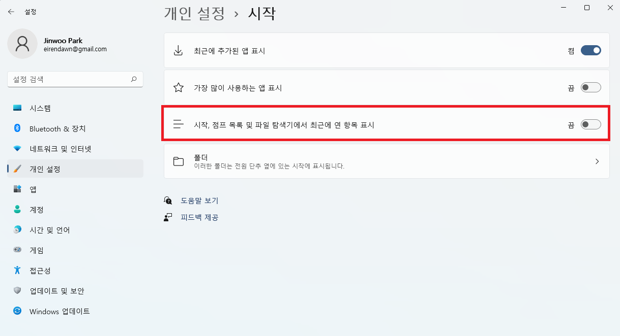 2. [시작, 점프 목록 및 파일 탐색기에서 최근에 연 항목 표시] 설정 OFF