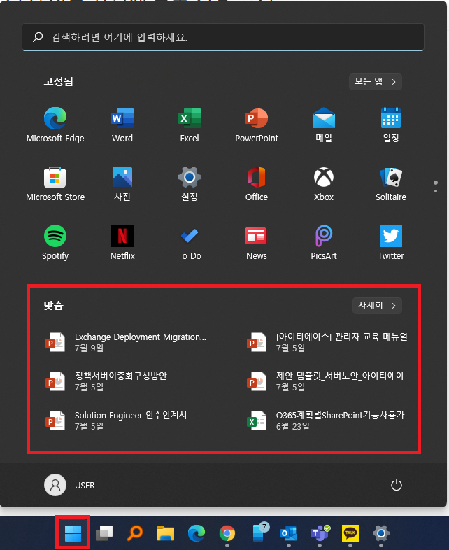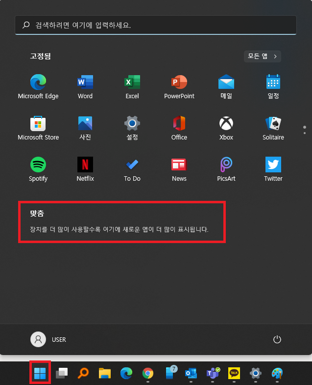 Windows 11 시작 화면에서 [맞춤] 기능 OFF 방법에 대해 기술