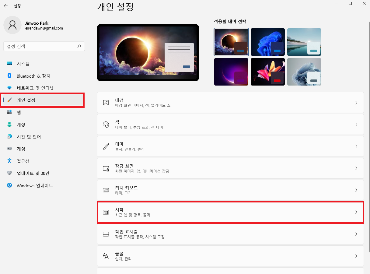 1. [설정] > [개인 설정] > [시작]