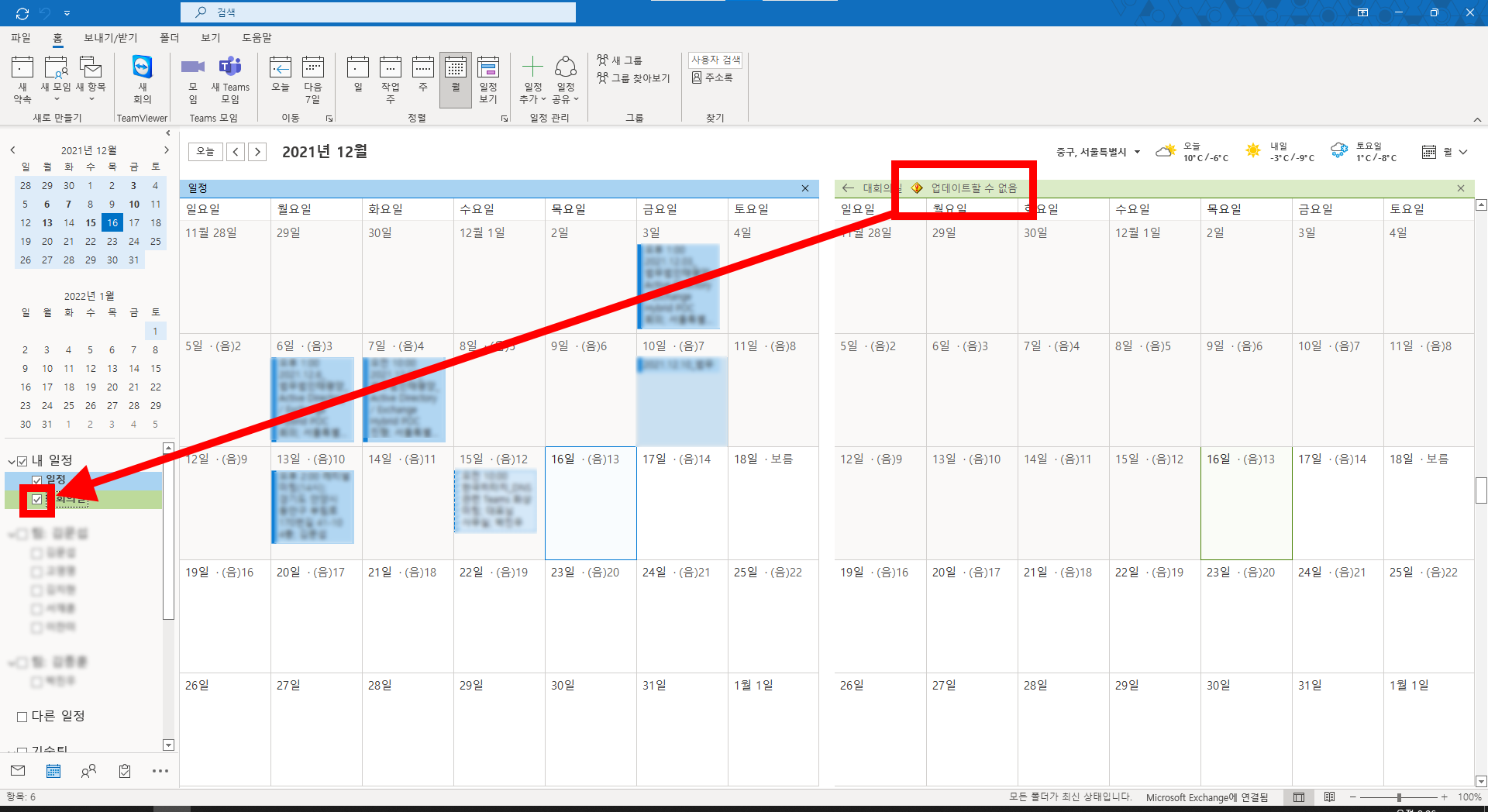 3. 대회의실의 정보가 “업데이트할 할 수 없음”으로 진행되므로, 체크를 해제합니다.