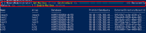 - 명령어 : Get-Mailbox -Filter {ArchiveGuid -Eq "00000000-0000-0000-0000-000000000000" -AND RecipientTypeDetails -Eq "UserMailbox"} | Enable-Mailbox -Archive