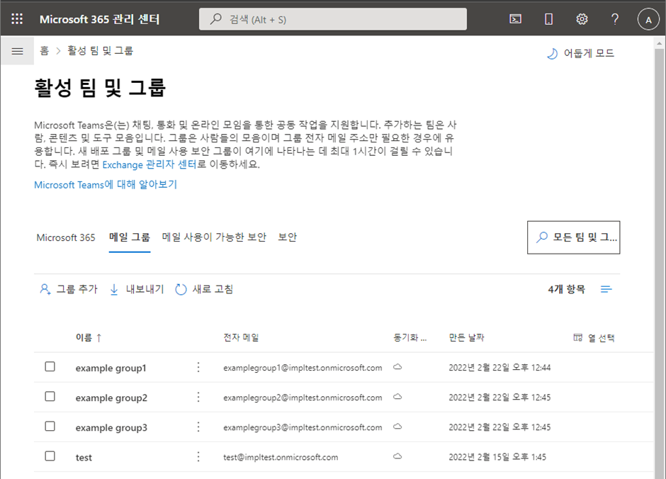 3. 일정 시간이 지나면, Office 365 메일 그룹이 생성된 것을 확인할 수 있습니다.