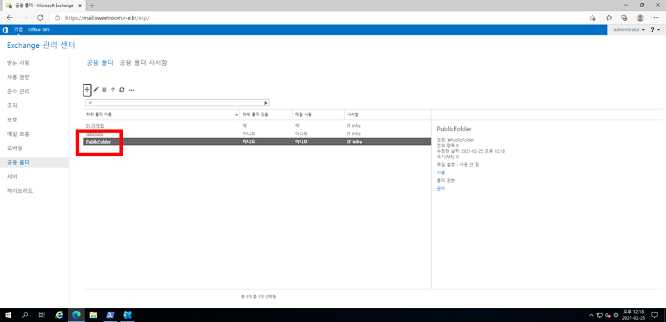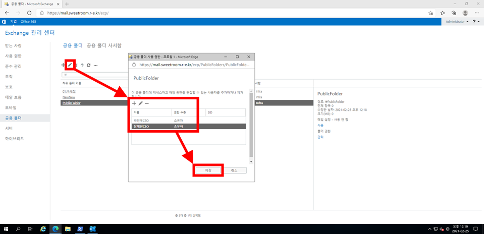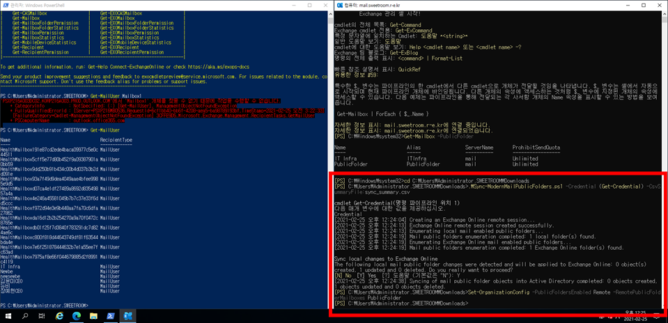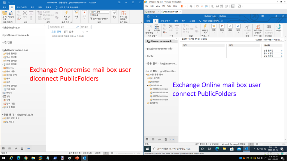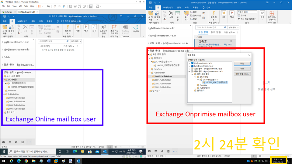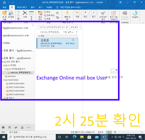 B. 3분정도 뒤 Exchange Onpremise mail box user에서 Exchange Online mail box user가 공용 폴더를 볼 수 있는 권한이 넘어갑니다.