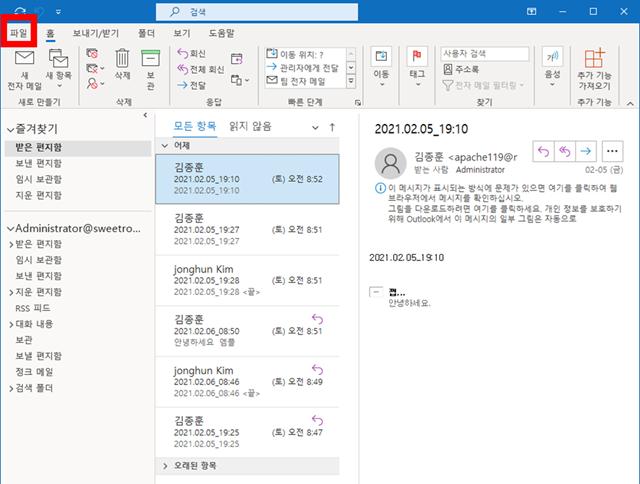5. Outlook Application으로 exchange on-premises 사용자 메일함 연결 및 동기화
