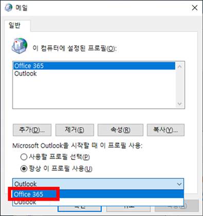 11. Outlook Application 종료 후 Outlook 프로파일 재생성 및 Office 365 Exchange Online으로 사용자 연결