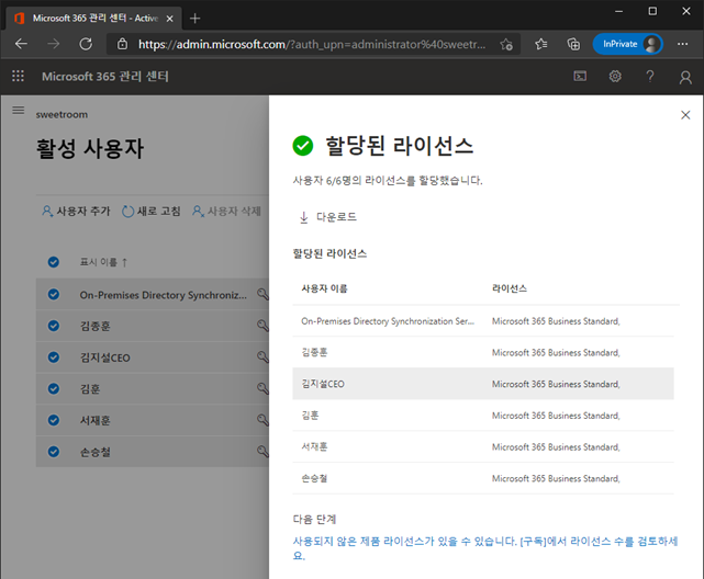 7. Office 365에 동기화 된 사용자 Exchange Online License 부여
